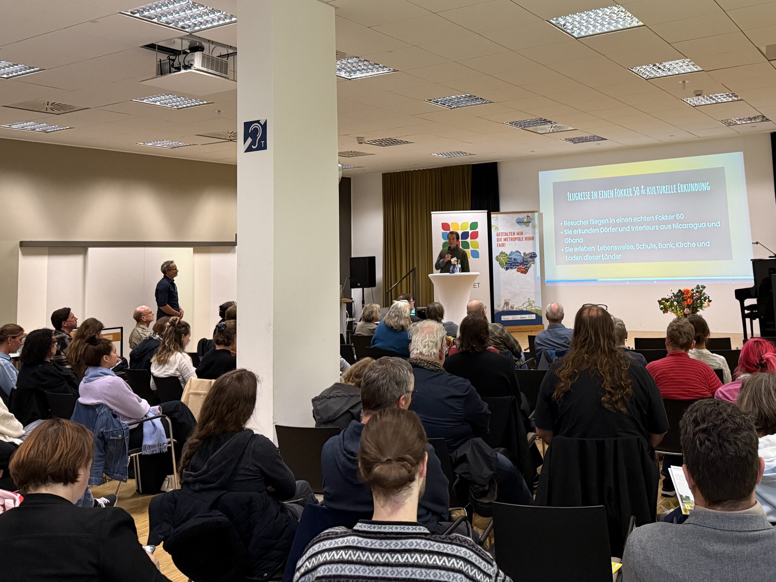 Die Veranstaltung begann mit einem Grußwort von Bürgermeisterin Edeltraud Klabuhn und einem Dialog zwischen Dodo Schulz (Eine-Welt-Regionalpromotorin und Geschäftsführung EXILE-Kulturkoordination e. V.) und Horst Fischer (Geschäftsführer der IGA 2027) über die Zusammenarbeit der Fairen Metropole Ruhr 2030 mit der IGA 2027 sowie den aktuellen Stand der Planungen der IGA 2027. Anschließend stellte Vera Dwors (Vorstand Faire Metropole Ruhr / Eine Welt Netz NRW) die neue Wende-Broschüre zur Kooperation zwischen der IGA 2027 und der Fairen Metropole Ruhr vor. Darüber hinaus präsentierten Hans van de Ven und Gerard van de Hombergh den Weltpavillon Steyl in den Niederlanden.