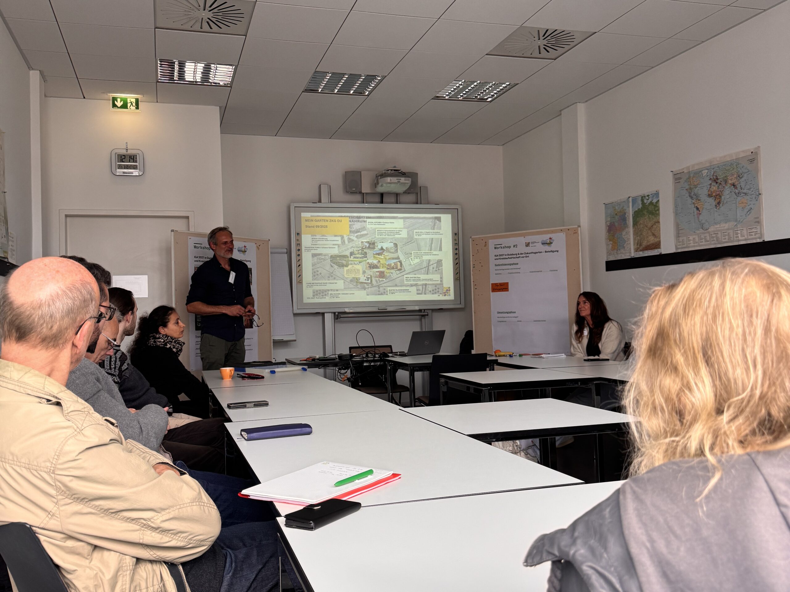 Nach einem gemeinsamen Gruppenfoto verteilten sich die Teilnehmenden auf drei Workshops, die unterschiedliche Schwerpunkte rund um die IGA 2027 setzten. Im Fokus standen dabei die Projektplattform „Mein Garten“, Fragen der Beteiligung und Kreislaufwirtschaft auf dem Duisburger IGA-Gelände sowie die Verbindung von Fairem Handel und den SDGs. Den Abschluss bildeten ein gemeinsamer Imbiss und ein einstündiger Rundgang über das Gelände des Duisburger Zukunftsgartens, bei dem Bauvorhaben, Projektstand und Hintergrundinformationen vorgestellt sowie Fragen der Teilnehmenden beantwortet wurden.